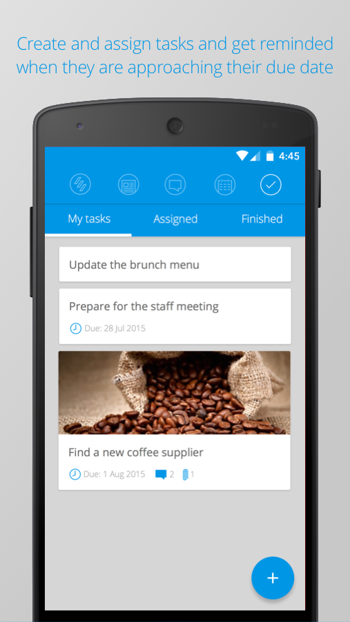 Tasks: create and assign tasks and get notified when they are completed. Remind employees about upcoming deadlines.