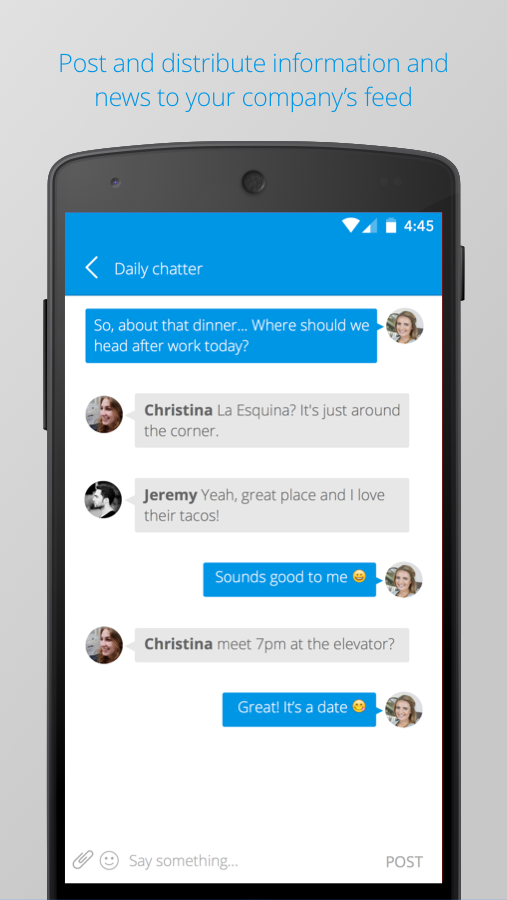 Messages: send messages and chat with employees, share photos, videos, and links with coworkers – either in groups or individually.